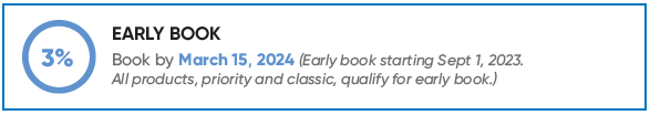 Book by March 15, 2024 and save 3%. (Early book starting Sept 1, 2023. All products, priority and classic, qualify for early book.)