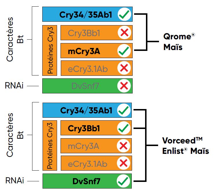 Figure 1. Modes d’action de la protection contre la CRM dans le maïs Qrome (Bt bimode) et le maïs Vorceed Enlist (Bt bimode + ARNi).
