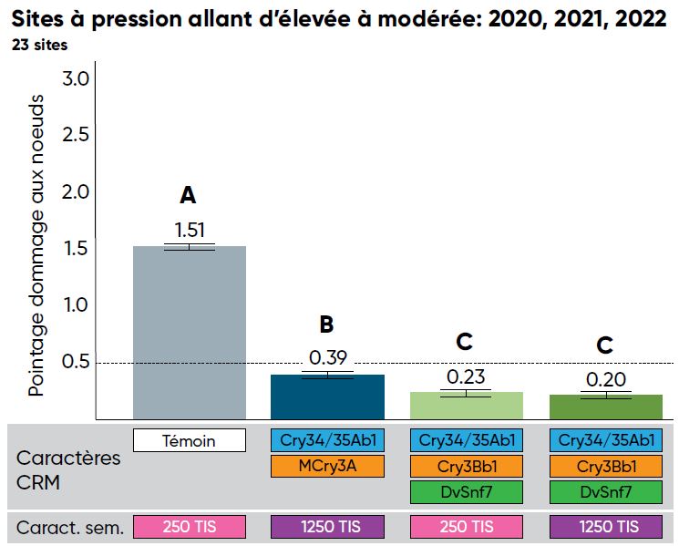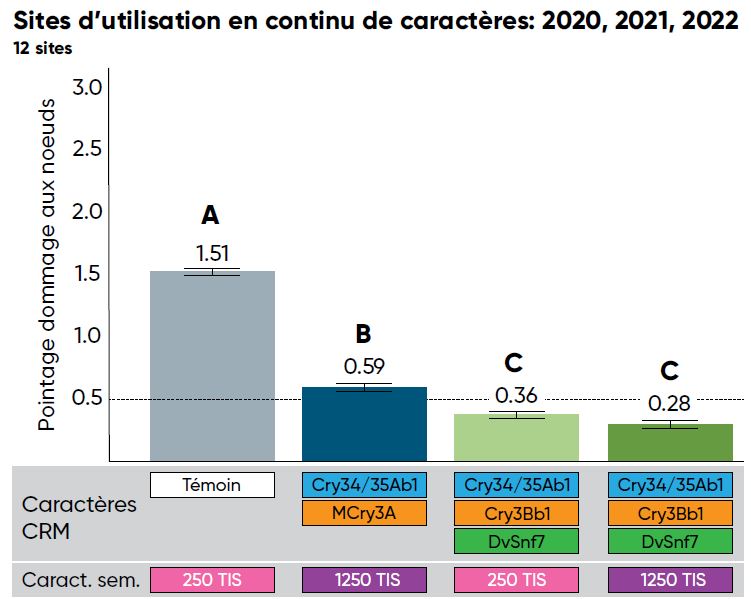 Figure 3. Pointages des dommages aux noeuds par la CRM sur douze sites de maïs en continu, ayant un historique d’utilisation de caractères CRM. Les barres avec la même lettre ne sont pas significativement différentes à α = 0,05.