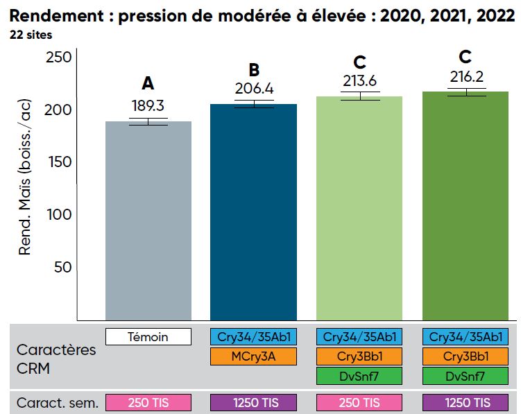 Figure 5. Rendement en maïs sur 23 sites dont la pression allait de modérée à élevée. Les barres avec la même lettre ne sont pas significativement différentes à α = 0,05.